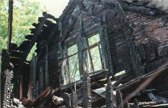 Fire destroys the home in 1994, the front entrance (left) and side view (middle). Anne assesses the damage (right).