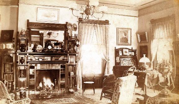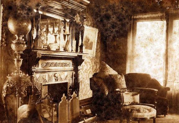 shelves for displaying their fine collections. The parlor, with its damask patterns and velvet fabrics,