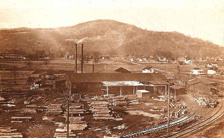 Basket Factory at White House. On extreme left is the bridge over Oswayo Creek. The house in the rear and at the right end