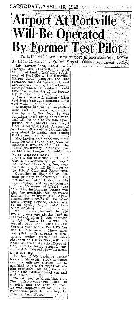 #1 Did you know that Portville had an airport?! Well, an article from our files dated Saturday, April 13, 1946 confirms it. Here are three photos of Lee Layton and his flying operation and the article below. You can read more about Lee in our World War II book, Portville Goes to War.