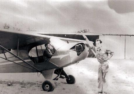 Lee Layton in his "Peggy" plane. On the propeller is George Ingram.