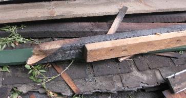 had been a fire in that section years ago. The charred studs and rafters were just reinforced with