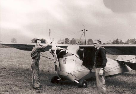 Lee Layton in his "Peggy" plane. On the propeller is George Ingram.